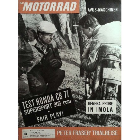 Inhalt: Fair Play DAS MOTORRAD tostet: HONDA CB 77,305 ccm, Supersport Generalprobe in Imola Scott. Die denkwürdige Geschichte eines denkwürdigen Motorrades (5) Peter Frosters Triel-Reise Deutsche Geländemeistersdiaft Zweiter Lauf, Westfalen-Lippe-Fahrt Zwei Funken je Umdrehung Avus-Maschinen Zum Int. 24-Stunden-Ronnon am 4./5. Mai, Berlin Gewußt wo Reden wir vom Sport Die Sache Camathias Gesehen — Gehört — Gelesen Ganz unter uns BMW-Treffen in Nürnberg Unser Versicherungsonkel