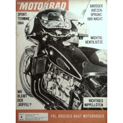 Inhalt: Public Relations Fräulein Greeves baut Motorräder Geschraubtes vom Elefantentreffen (Wo bleibt der Büffel?) Der große Katzensprung; Ziel 1001 Nacht Sidecar-Safari ippel richtig weichlöten Elefanten-Fahrt 1964 Drehzahlmarkierungen auf dem Tachometer Kummer mit Gewinden? Ernst Henne 60 Jahre alt Neue Moto Cross-Maschinen aus Italien Vom Vater der Megola Ventilsitze — kurz beleuchtet Verrückte Bankette Sporttermine 1964 Gewußt wo Ganz unter uns