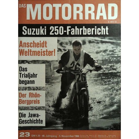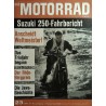 Inhalt: Wird es deutsche Rennmaschinen geben? Letzter Lauf zur Straßenweltmeisterschaft: Anscheidt Weltmeister! DAS MOTORRAD fuhr: Suzuki 250 ccm T 20, Sechsgang Rhön-Bergpreis Die Jawa-Geschichte (I) Geröll und Wurzeln als Auftakt zur Deutschen Trialmeisterschaft Mit dem Wind über die Rhön int. Sandbahnrennen in München Neuer Amal-Ringschwimmervergaser Die Gebrauchtkauf-Lotterie Was so alles bricht und reißt Richtig Metallkleben DAS MOTORRAD baut am Motor HONDA CB 450 (7) Nach der TT Das Letzte
