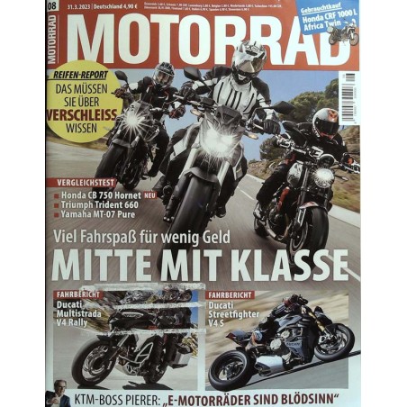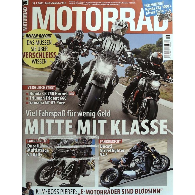 TEST+TECHNIK Fahrbericht Ducati Multistrada V4 Rally Mehr Reise und Offroad bei weniger Durst, wie gut klappt das? Fahrbericht Ducati Streetfighter V4 S Der Pitbull unter den Nakeds nach der ersten Frischzellenkur Vergleichstest Mittelklasse-Nakeds Honda CB 750 Hornet vs. Triumph Trident 660 und Yamaha MT-07 Pure - nackte Herausforderung Fahrbericht CFMoto 450 SR Einsteiger-Sportler aus China Vergleichstest Leichte Nakeds Kawasaki Z 400 gegen QJ Motor SRK 400 - ein Tip fur Einsteiger? Test kompakt Neue Zubehör-Produkte - nicht nur (aber auch) zum 1. April