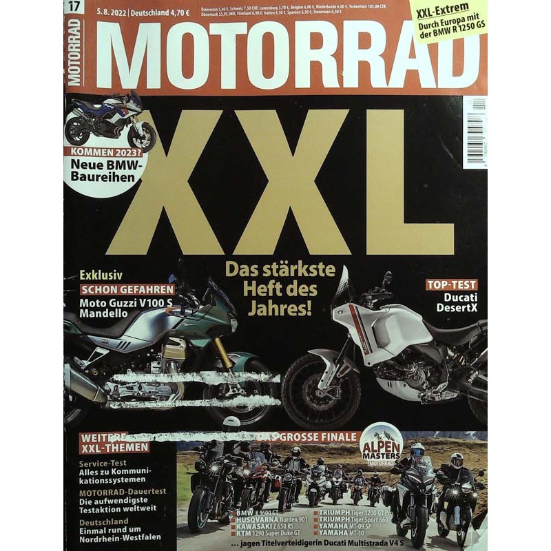 PLUS: Top Test: Ducati DesertX - Exclusiv schon gefahren: Moto Guzzi V100 S Mandello - Kommen 2023? Neue BMW Baureihen? - XXL-Extrem: Durch Europa mit der BMW R 1250 GS - Das grosse Finale Alpen Masters: BMW K 1600 GT, Husqvarna Norden 901, Kawasaki Z 650 RS, KTM 1290 Super Duke GT, Triumph Tiger 1200 GT Pro, Triumph Tiger Sport 660, Yamaha MT-09 SP, Yamaha MT-10 jagen Titelverteidigerin Ducati Multistrada V4 S - Service Test: Alles zu Kommunikationssystemen - Motorrad Dauertest: Die aufwendigste Testaktion weltweit - Deutschland: Einmal rund um Nordrhein westfalen