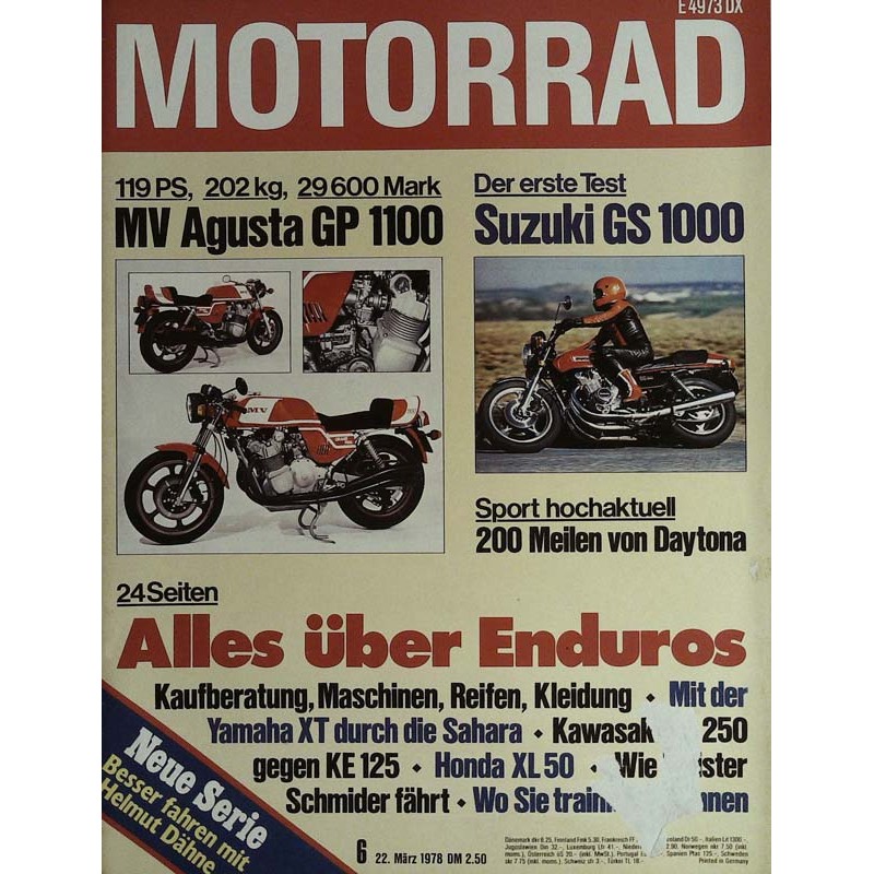 TECHNIK UND TEST Vorstellung MV Agusta Grand Prix 1100 Großer Preis Test Honda XL 50 Kleiner Geländegänger Nachrichten Alles über stimmos Langstreckentest: Mit der Yamaha XT 500 durch die Sahara Heißer Ritt Fahrtechnik Hohe Schule des Geländefahrens Wo man fahren darf Spielzeug mit Grenzen Marktübersicht aller Enduros Die Hartmacher Doppeltest Kawasaki KL 250/KE 125 Biedermann und Brandstifter MOTORRAD-Technik 6: Zylinderkopfgestaltung und Ventiltrieb, Ventilsteuerungen Comic: Enduro Almtraum