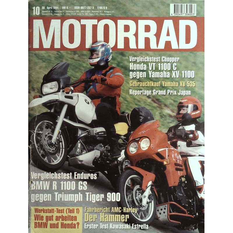 TEST & TECHNIK Fahrbericht Cagiva Mito 125. Die Ducati 916 en miniature. Von Monika Schulz Vergleichstest Reise-Enduros. BMW R 1100 GS und Triumph Tiger 900, die Giganten unter den Reise-Enduros, treffen aufeinander. Von Gerhard Lindner Fahrbericht AMC-Harley. Im Spezialrahmen mutierte der 1340er Harley-Twin zum eigenwilligen Sportler. Von Werner Koch Vergleichstest Chopper. Nicht nur Harleys tragen lange Gabeln: Honda VT 1100 C gegen Yamaha XV 1100. Von Michael Schäfer Test Jawa 350 Typ 640 style. Ist der 23-PS-Zweizylinder-Zweitakter ein toller Typ? Von Jürgen Schmitz Technik-Elnmajelns. Grundlagen verständlich erklärt (Teil 1). Von Rainer Bäumel