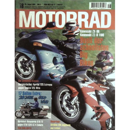 TEST & TECHNIK Härtetest Sport-Enduros. 5000 Kilometer trieben Husquarna 610 TE und KTM 620 LC 4 an ihre Grenzen. Von Gert Thöle Abgasnormen. Wer Gas gibt, produziert auch Abgase. Wo steht die Motorradtechnik? Von Rainer Bäumel und Berit Horenburg Kurztest MuZ Silver Star Classic. Nach Leistungskur erneut auf dem Prüfstand. Hat er endlich 34 PS? Von Werner Koch Vergleichstest Sport-125er. Aprilia 125 Extrema gegen Cagiva Mito 125. Von Monika Schulz Extra: 20 Jahre Honda Gold Wing. Fahrer-Porträts. Von Dieter Loßkarn Modellreport. Von der sportlichen 1000 zum Supertourer 1500. Von Michael Allner Von Claus-Georg Petri Clubs, Adressen, Bücher.