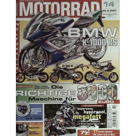Test + Technik Neuheiten BMW K 1000 RS, Aprilia RS 1000 V4, Duell XB12 RRS KTM-Erlkönige RC4, 690 Baja, Duke III Vergleichstest Supermotos BMW HP2 Megamoto, Ducati Hypermotard 1100 S und KTM 950 Supermoto Technik Fahrwerksprobleme Welche Lösungen es gibt Test compact Fahrberichte Yamaha YBR 125, Daelim Roadwin 125 R, Anti-Hopping-Kupplung für BMW-Boxer Was gibt's für 8000 Euro? Das Angebot in dieser Preisklasse ist vielfältig und gar nicht so klein MOTORRAD stellt sieben von insgesamt 23 Modellen dieses Preissegments vor Gebrauchte Motorräder um 8000 Euro Muss es eine Neue sein9 Gebraucht gibt's im Vergleich zum Neupreis oft günstige Offerten Dauertest-Zwischenbilanz Kawasaki ZZR 1400 Bei 31000 Kilometern ist noch lange nicht Schluss Track-Test Ducati 1098 und Triumph Daytona 675