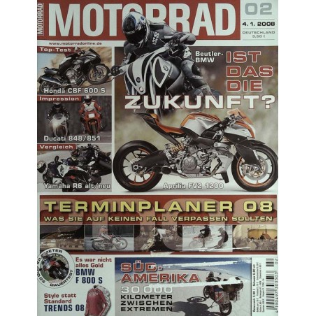 PLUS: Top Test: Honda CBF 600 S - Impression: Ducati 848 / 851 - Vergleich: Yamaha R6 alt / neu - Terminplaner 2008: Was Sie auf keinen Fall verpassen sollten - Süd Amerika: 30000 Kilometer zwischen Extremen - Es war nicht alles Gold: BMW F 800 S - Style statt Standard: Trends 2008 - 50000 km Dauertest: BMW F 800 S