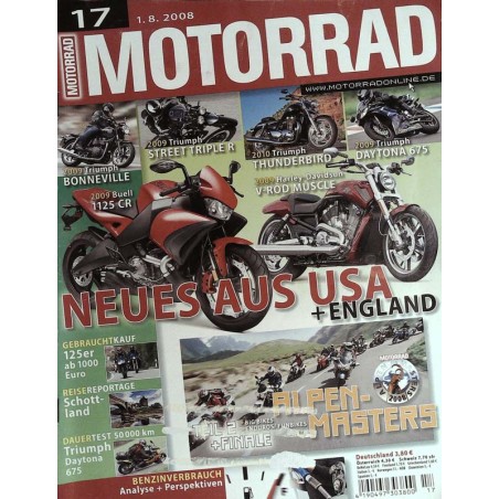 TEST+TECHNIK /// Neuheiten Die Modelle für 2009: Triumph Street Triple R, Bonneville, Thunderbird und Daytona 675; Harley-Davidson V-Rod Muscle; Buell 1125 CR Blickpunkt: Benzinverbrauch Was moderne Motorräder wirklich verbrauchen, warum Autos mehr Sprit schlucken und wie man einfach Benzin sparen kann Alpen-Masters, Teil 2 Wie die Vorrunden bei Big Bikes und Enduros/Funbikes liefen. Und wie das große Finale um den Alpen-Masters-Pokal 2008 ausging Dauertest-Abschlussbilanz Triumph Daytona 675 Der Dreizylinder spulte die 50 000 Kilometer problemlos ab. Ob's nach dem Zerlegen genauso gut ausschaut? Test LKM-Suzuki Hayabusa Stolze 215 PS entlockt LKM-Chef Hennes Löhr der eh schon nicht schwachbrüstigen Hayabusa