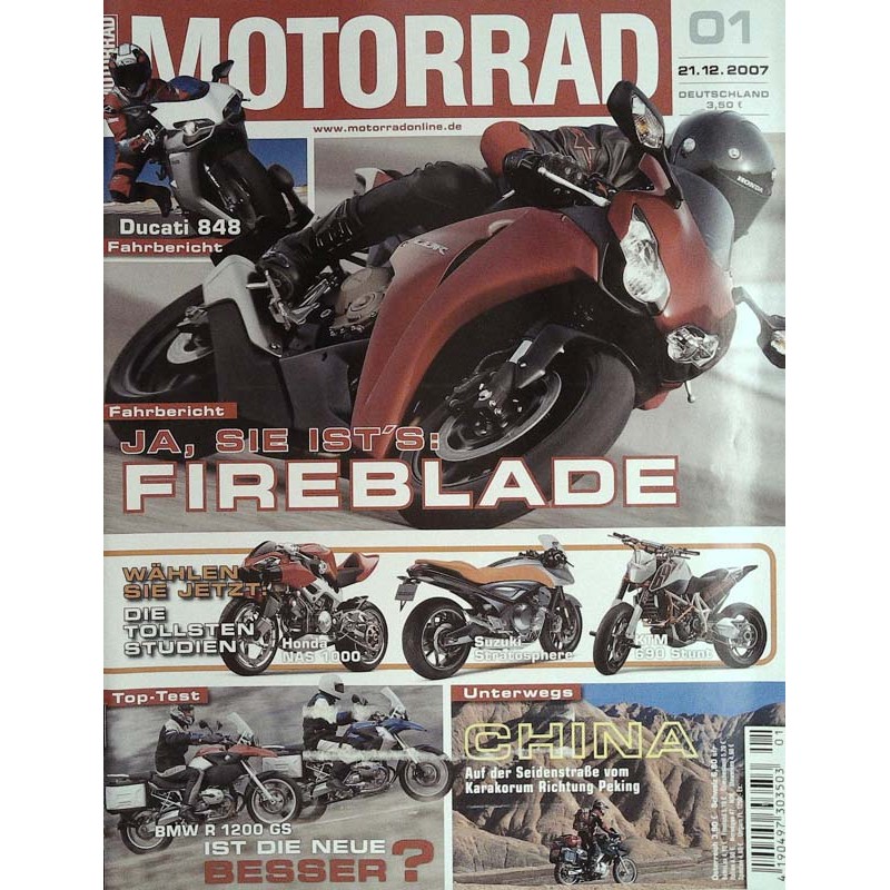 Test + Technik: Neuheiten KIM, Royal Enfield; Studien von Suzuki und Triumph Fahrbericht Honda Fireblade Leichter, stärker, besser? Hondas neue Fireblade Fahrbericht Ducati 848 Weniger ist manchmal mehr: die kleine Schwester der Ducati 1098, die neue 848 Doppel-Top-Test BVW R 1200 GS Leserwahl Die schönsten Design-Studien der letzten Jahre Vergleichstest Kawasaki ER-Sf gegen Suzuki GSX 650 F Test compact Fahrbericht Sherco 2.5 i; Dauertest-News: Interview zu Undichtigkeiten an BMW-Bremsen MOTORRAD-Bestenliste Alle 2007 getesteten Modelle in der Übersicht