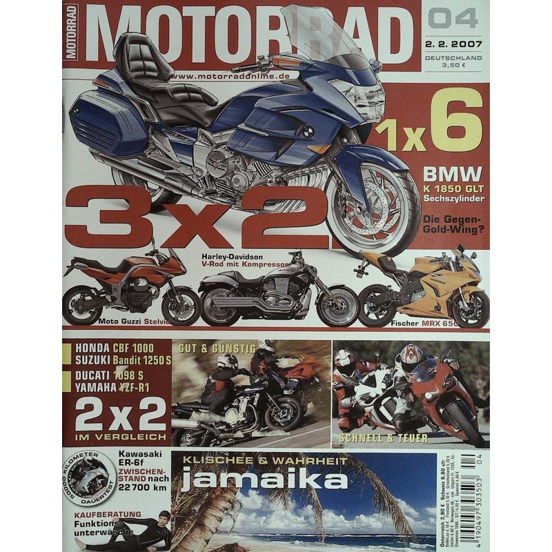 Test + Technik Neuheiten Geheime Pläne von BMW der Sechszylinder-Großtourer Zwischen Reise-Enduro und Funbike Moto Guzzi Stelvio Vergleichstest Allrounder Zwei Preisbrecher im Infight. Suzukis neue mächtige Bandit 1250 S gegen Hondas grundsolide CBF 1000 Fahrbericht Fischer MRX Schnittiges Sportbike mit 650er-Twin von Hyosung Fahrbericht Vee-Two-Harley V-Rod Ein Kompressor blast 160 PS in den Ami-V2 Vergleichstest Supersportler Das ewige Duell Zwei- gegen Vierzylinder. Ducati 1098 S gegen Yamaha YZF-R1 Test compact Fahrbericht Honda Gold Wing mit Navi und Airbag Impression Suzuki GSX-R 750 von 1991 Dauertest-Zwischenbilanz Kawasaki ER-6f