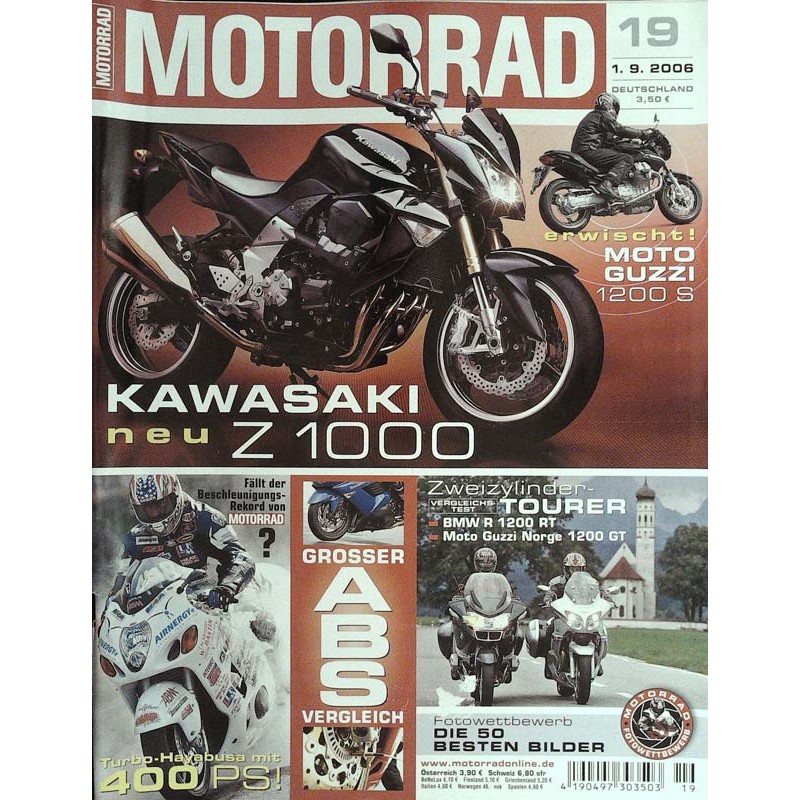 Test + Technik Neuheiten Frisch renoviert: Kawasaki Z 1000; Moto-Guzzi-Breva-Ableger mit 1200er-Zweizylinder Großes ABS-Spezial Elf Motorräder von BMW bis Triumph mit ganz unterschiedlichen Antiblockiersystemen im Vergleich Dazu die Technik und die Historie Beschleunigungs-Rekordversuch Ein bekennender Speediunkte, eine MAB-Hayabusa Ihr Ziel. die Bestmarken von MOTORRAD zu knacken Vergleichstest Einzylinder Aprilia Pegaso 650 Strada, Derb' Mulhacän 659 und Yamaha MT-03 Dauertest-Zwischenbilanz Triumph Sprint ST Vergleichstest Tourer BMW R 1200 RT gegen Moto Guzzi Norge 1200 GT Erwächst der beliebten RT mit dem italienischen Reiseschiff echte Konkurrenz? Test compact Fahrbericht Harley-Davidson Fat Boy, Modell 2007, Fahrbericht Bimota DB5R, Dauertest-News