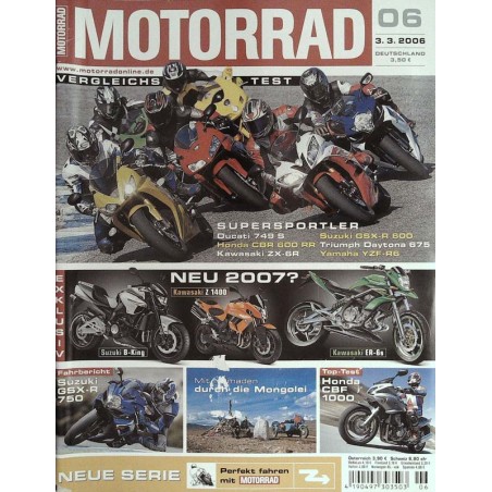 test + technik Neuheiten Ducati, Kawasaki und Suzuki bringen frischen Wind in die Mittel- und Oberklasse Fahrbericht Suzuki GSX-R 750 Top-Test Honda CBF 1000 Der designierte Bestseller 2006 brilliert mit bestechender Ausgeglichenheit, ABS und gunstigem Preis Fahrbericht Aprilia RSV 1000 R Aprilia hat sein sportliches Flaggschiff fur 2006 überarbeitet Vergleichstest Supersportler Der aktuelle Supersport-Jahrgang steigt in den Ring, auf Landstraße und Rennstrecke Ducati 749 S, Honda CBR 600 RR, Kawasaki ZX-6R, Suzuki GSX-R 600 Triumph Daytona 675 und Yamaha YZF-R6 Test Yamaha FJR 1300 A, Modell 2006 Neue Serie: Perfekt fahren mit MOTORRAD Mehr Fahrspaß, mehr Sicherheit dank Profi-Tipps Teil 1 der siebenteiligen Serie Kurvenfahren Test compact Wunderich-BMW R 1150 GS Adventure, Ducati Monster S4R mit Racekit; Yamaha MT-01 Edition Dauertest Yamaha XT 660 X
