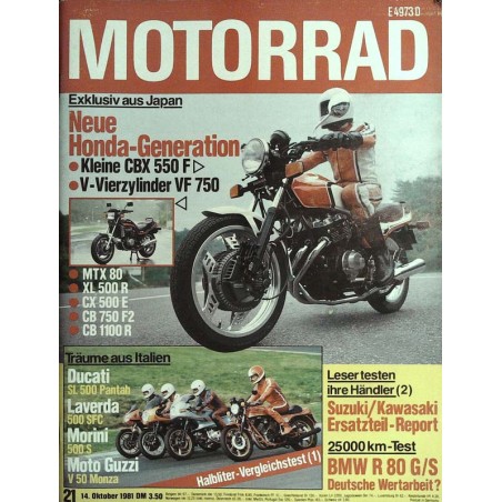 TECHNIK UND TEST Vergleichstest italienischer Halblitermaschinen, Teil 1 Südfrüchte Test Kawasaki KL 250 Tendenz fallend Test Honda CY 80 Viertakt-Floh 25 000 Kilometer mit der BMW R 80 G/S Deutsche Wertarbeit Vorstellung Max-BMW R 80 G/S Maximal Nachrichten MOTORRAD intern Tauschgeschäfte Technik aktuell: Moderne Hinterradfederungssysteme Auf die Hinterbeine gestellt