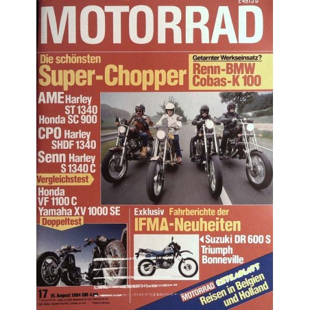 PLUS: Getarnter Werkeinstaz? Renn-BMW, Cobas-K 100 - Vergleichstest: Honda VF 1100 C, Yamaha XV 1000 SE Doppeltest - Fahrberichte der IFMA Neuheiten: Suzuki DR 600 S, Triumph, Bonneville - Extrblatt: Reisen in Belgien und Holland
