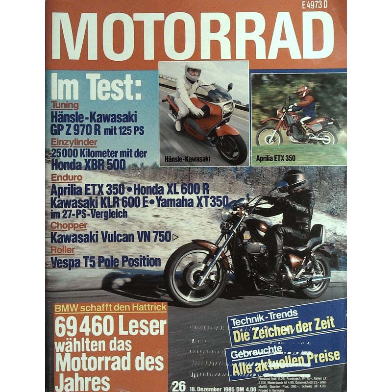 PLUS: Tuning: Hänsle Kawasaki GP Z 970 R mit 125 PS - Einzylinder: 25000 Kilometer mit der Honda XBR 500 - Enduro: Aprilia ETX 350, Honda XL 600 R, Kawasaki KLR 600 E, Yamaha XT 350 im 27 PS Vergleich - Roller: Vespa T5 Pole Position - Technik Trends: Die Zeichen der Zeit - Gebrauchte: Alle aktuellen Preise - BMW schafft den Hattrick