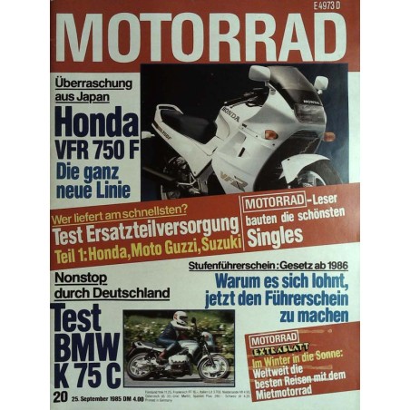 PLUS: Wer liefert am schnellsten? Test Ersatzteilversorgung Teil 1. Honda, Moto Guzzi und Suzuki - Motorrad-Leser bauten die schönsten Singles - Stufenführerschein: Gesetz ab 1986, warum es sich lohnt, jetzt den Führerschein zu machen - Nonstop durch Deutschland: Test BMW K 75 C - Motorrad EXTRABLATT: Im Winter in die Sonne, weltweit die besten Reisen mit dem Mietmotorrad