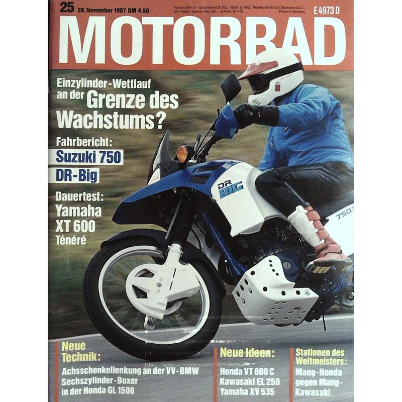 TEST & TECHNIK Achsschenkellenkung der VV-BMW Führungskraft Yamaha XT 600 Tenere: Langstreckentest Nicht ganz dicht Kawasaki Voyager XII: Fahrbericht Wohnmobil Kawasaki EL 250 Eliminator: Test Rohrspatz Yamaha XV 535: Test Young Americans Honda Gold Wing GL 1500/6: Vorstellung GL, da staunste Entwicklung der Einzylindermotoren Probleme der Singles