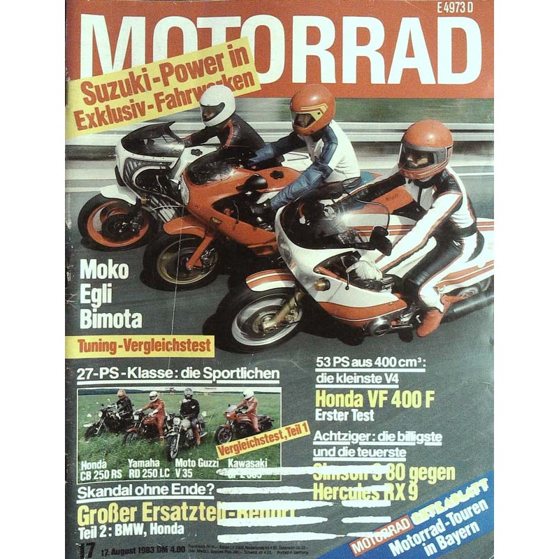 PLUS: Tuning Vergleichstest: 27 PS Klasse die Sportlichen: Honda CB 250 RS, Yamaha RD 250 LC, Moto Guzzi V 35, Kawasaki - 53 PS aus 400 cm³: die kleinste V4 Honda VF 400 F erster Test - Achtziger, die billigste und die teuerste: Simson S 80 gegen Hercules RX 9 - Skandal ohne Ende? Großer Ersatzteil Report, Teil 2 BMW, Honda - Motorrad EXTRABLATT: Motorrad Touren in Bayern