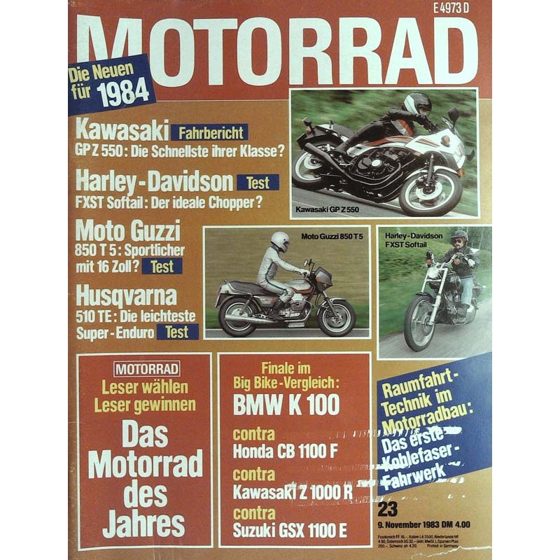 Titelbild: Die neuen für 1984: Kawasaki GP Z 550, die schnellste ihrer Klasse? - Harley-Davidson FXST Softail, der ideale Chopper?, Moto Guzzi 850 T 5, sportlicher mit 16 Zoll - Husqvarna 510 TR, die leichteste Super Enduro