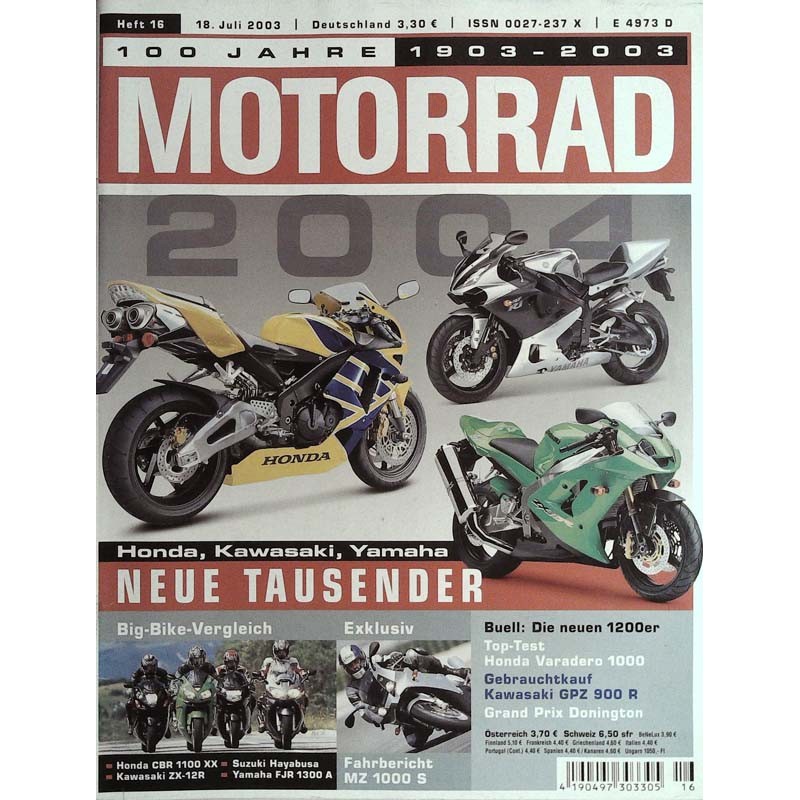 PLUS: Bike Bike Vergleich: Honda CBR 1100 XX, Suzuki Hayabusa, Kawasaki ZX-12R, Yamaha FJR 1300 A - Exklusiv: Fahrbericht MZ 1000 S - Buell: Die neuen 1200er - Top Test: Honda Varadero 1000 - Gebrauchtkauf Kawasaki GPZ 900 R - Grand Prix Dongton