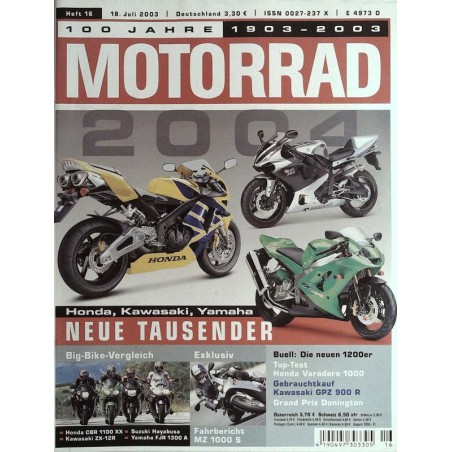 test + technik Neue 1000er-Supersportler Honda, Kawasaki und Yamaha haben einiges in petto Fahrbericht Buell Firebolt X812R und Lightrnng XB12S Fahrbericht MZ 1000 S Lang erwartet, nun endlich serienreif - MOTORRAD ließ den Paralleltwin ballern Test Yamaha TI 600 RE Yamahas Allround-Enduro bekam E-Starter und niedrigere Sitzhöhe Vergleichstest Big Bikes Honda CBR 1100 XX, Kawasaki ZX-12R, Suzuki GSX 1300 R Hayabusa und Yamaha FJR 1300 A Technik Shell V-Power - was bringt der hochoktanige Kraftstoff? Top-Test Honda Varadero 1000