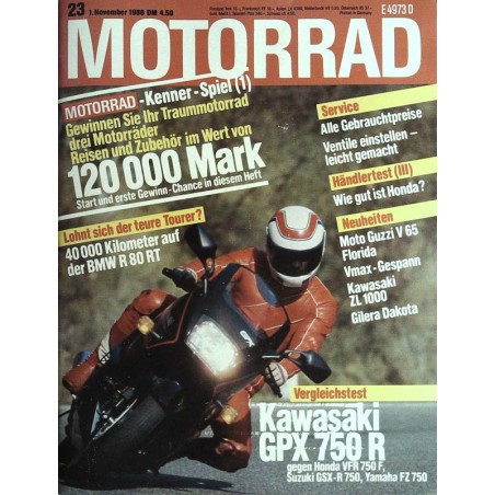 PLUS: Lohnt sich der teure Tourer? 40000 Kilometer auf der BMW R 80 RT - Motorrad Kenner Spiel (1) - Service: Alle Gebrauchtpreise, Ventile einstellen leicht gemacht - Händlertest (3) Wie gut ist Honda? - Neuheiten: Moto Guzzi V 65 Florida, Vmax Gespann, Kawasaki ZL 1000, Gilera Dakota