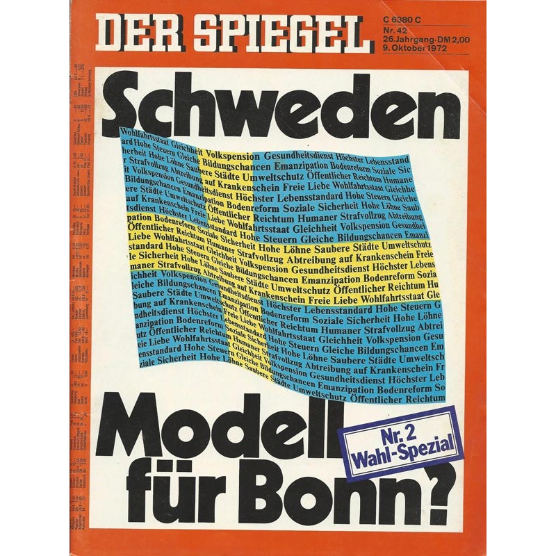 Schweden - Beispiel oder Abschreckung?: "Schaut nicht nach Norden", warnt die CDU auch in diesem Wahlkampf. Die SPD, vor die Wahl gestellt, aus Deutschland "ein kleines Amerika oder ein großes Schweden" zu machen, entschiede sich - so Erhard Eppler - für den nordischen Wohlfahrtsstaat, der die wichtig Osten sozialen Probleme gelöst hat und, so der Futurologe Herman Kahn, im Jahr 2000 als einziges Land in Europa die postindustrielle Gesellschaft erreicht haben wird.