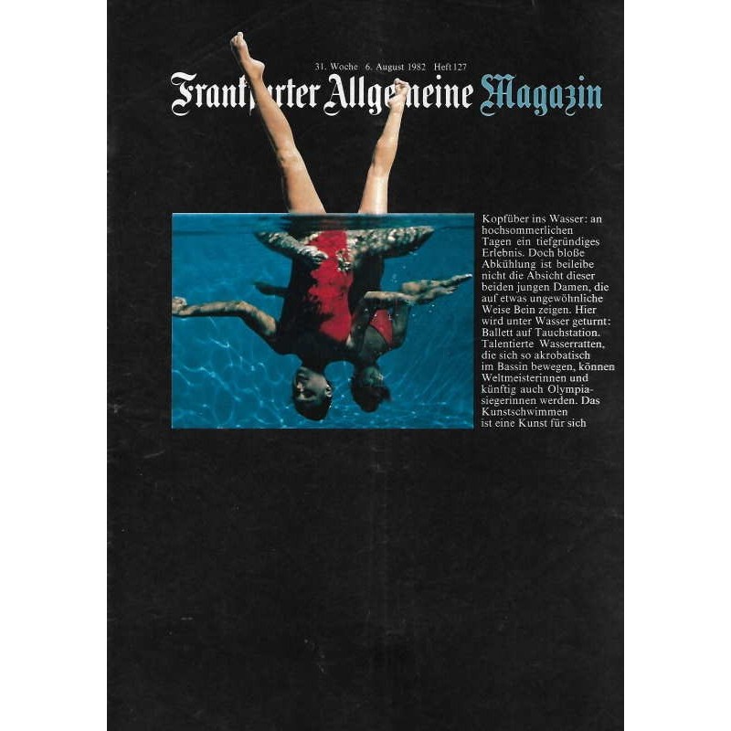 Titelbild: Kopfüber ins Wasser: an hochsommerlichen Tagen ein tiefgründiges Erlebnis. Doch bloße Abkühlung ist beileibe nicht die Absicht dieser beiden jungen Damen, die auf etwas ungewöhnliche Weise Bein zeigen. Hier wird unter Wasser geturnt: Ballett auf Tauchstation. Talentierte Wasserratten, die sich so akrobatisch im Bassin bewegen, können Weltmeisterinnen und künftig auch Olympiasiegerinnen werden. Das Kunstschwimmen ist eine Kunst für sich