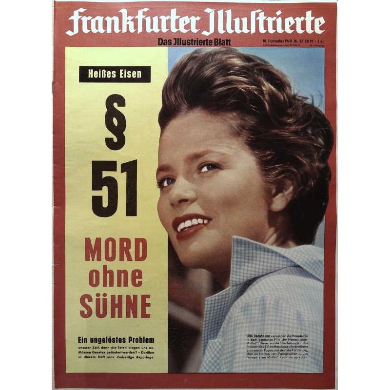 Titelbild: Ulla Jacobssan verkörpert die Hauptrolle in dem deutschen Film „Im Namen einer Mutter". Dieser ernste Film behandelt das Problem des §51 an Hand eines Verbrechens aus unseren Tagen, und stellt die Forderung, statt im Namen von Paragraphen — „im Namen einer Mutter" Recht zu sprechen.