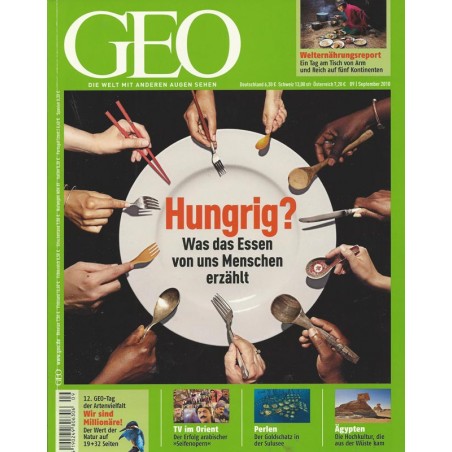 PLUS: Welternährungsreport: Ein Tag am Tische von Arm und Reich auf fünf Kontinenten - 12. GEO-Tag der Artenvielfalt Wir sind Millionäre! Der Wert der Natur auf 19+32 Seiten - TV im Orient: Der Erfolg arabischer Seifenopern - Perlen: Der Goldschatz in der Sulusee - Ägypten: Die Hochkultur, die aus der Wüste kam