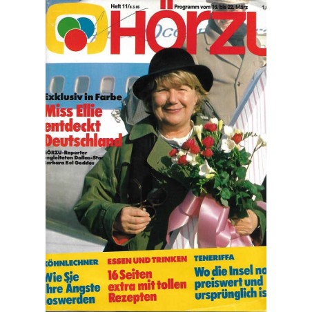 REPORTAGEN Bilanz des Eiswinters: Gefriertruhe Deutschland — die Frostkeule war schuld Leute, Namen, Nachrichten Zum Titelbild: Dallas-Star „Miss Ellie" entdeckt Deutschland — HÖRZU-Reporter waren dabei Wie paßt das zusammen — Millionen Arbeitslose und trotzdem Aufschwung? Zur großen Fernsehsendung über Bach: Er wollte die Welt nach Noten ordnen HÖRZU bei Deutschen in Namibia: Wenn's hier mal knallt, werden wir kämpfen Sieg für Tierschützer: Den Hunde-Schlächtern auf den Philippinen geht's an den Kragen Das Fernsehen feiert 50jähriges Jubiläum Margit Geisslers Karriere: Fix zum Grand Prix Hitchcock: „Ich hatte immer Angst vor der Polizei
