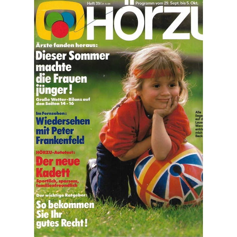 PLUS: Ärzte fanden heraus: Dieser Sommer machte die Frauen jünger! Große Wetter Bilanz - Im Fernsehen: Wiedersehen mit Peter Frankenfeld - Hörzu Autotest: Der neue Kadett. Sportlich, sparsam, familienfreundlich - Der wichtige Ratgeber: So bekommen Sie ihr gutes Recht!