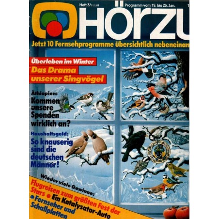 REPORTAGEN HÖRZU verlost jede Woche ein Rsauberesu Auto: Wieder ein Katalysator-Golf zu gewinnen! Der erste Gewinner eines Katalysator-Golfs Zum Titelbild — Vitus B. Dröscher: Nur jeder dritte Singvogel überlebt den Winter Karlheinz Böhm: Der Mann des Jahres Ein Gedicht für das Baby von Lady Di Shirley Bassey als Gaststar bei Bio Das große Problem der Hungersnot in Äthiopien: Kommen unsere Spenden wirklich an? Eine Frau zähmt die Supermänner: Jürgen Hingsen und Rolf Milser als Filmstars Cariddi Nardulli: Ihr Schrei machte sie zum Star Das GOLDENE-KAMERA-Spiel: Gewinnen Sie eine Reise nach Berlin! PROGRAMM VOM 19. - 25. 1. Video: Filme * Fernsehen * Technik Neues vom Phono- & Computer-Markt Beliebte und wichtige Sendungen der Woche Das farbige Fernsah- und Satellitenprogramm Fernsehen nächste Woche Das Hörfunkprogramm