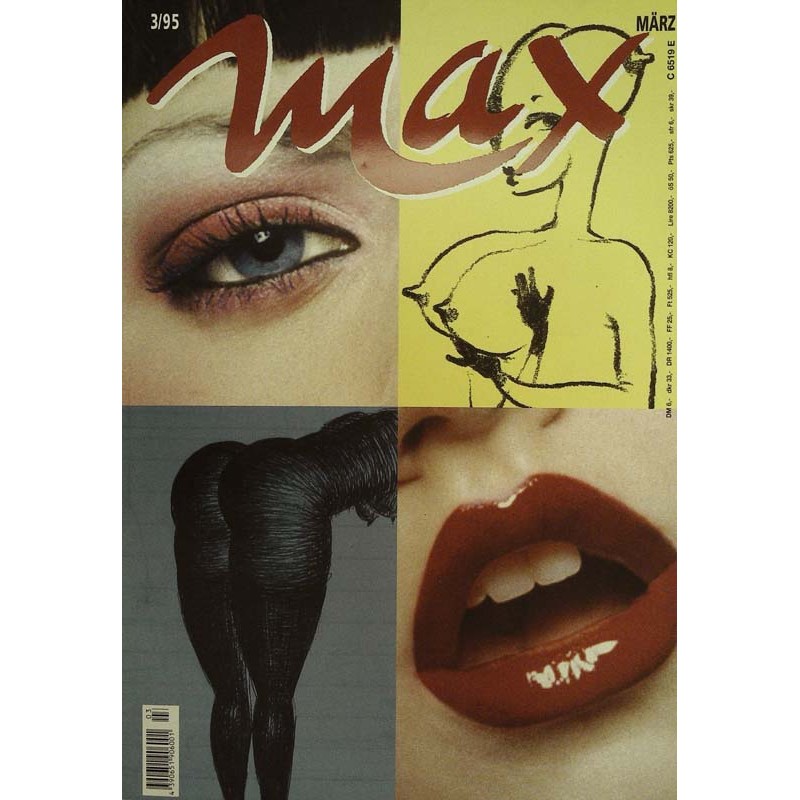 März 1995. eine besondere MAX-Ausgabe. Produziert gemeinsam mit drei jungen, erfolgreichen Amerikanern, die seit drei Jahren in New York das Magazin „Visionaire" auf den Markt bringen. Sie haben in diesem Heft mit uns nicht nur eigene Strecken produziert und den Innenteil layoutet, sondern auch den Titel gestaltet. Zusammengestellt ist das Cover aus Erotik-Zeichnungen des kubanischen Illustrators Ruben Toledo (gelbe Zeichnung), des französischen Art-Directors Jean-Paul Goude (blaue Zeichnung) und einem Foto aus der MAX-Modeproduktion von der Holländerin lnez van Lamsweerde.