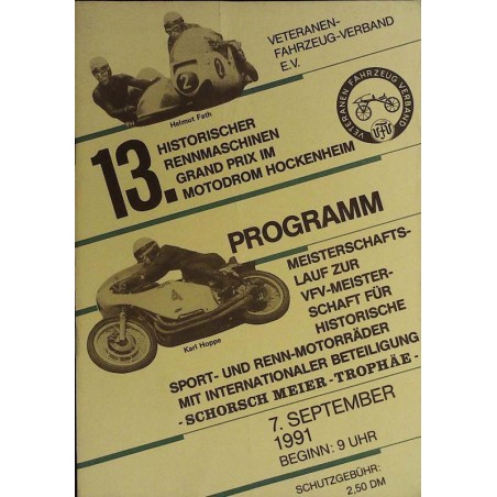 Titelbild: 13. Historische Rennmaschinen Grand Prix im Motodrom Hockenheim. Programm: Meisterschaftslauf zur VFV-Meisterschaft für historische Sport und Renn Motorräder mit internationaler Beteiligung Schorsch Meiser Trophäe. Beginn am 7 September 1991 um 9 Uhr morgens