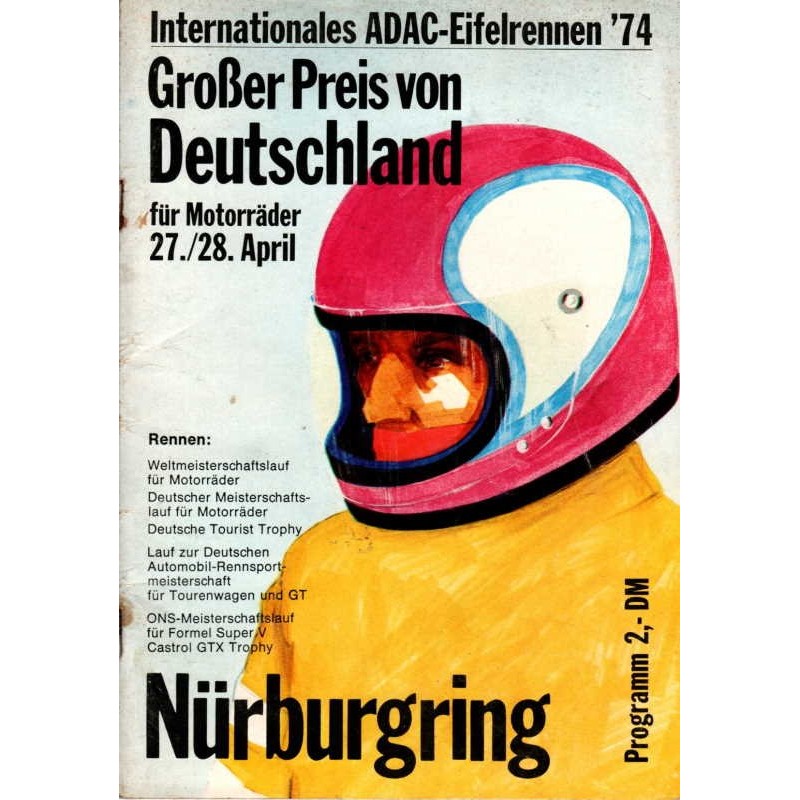Zeitplan: Training: Freitag, 26. 4. 1974 7.00 bis 8.00 Uhr freies Training Solomotorräder 125 ccm 8.15 bis 9.15 Uhr freies Training Solomotorräder 250 ccm 9.30 bis 10.30 Uhr freies Training Solomotorräder 50 ccm 10.45 bis 11.45 Uhr freies Training Solomotorräder 350 ccm 12.00 bis 13.00 Uhr freies Training Solomotorräder 500 ccm 13.15 bis 14.15 Uhr freies Training Motorräder Seitenwagen 14.30 bis 15.15 Uhr Zeittraining Solomotorräder 50 ccm 15.30 bis 16.30 Uhr freies Training Formel V 16.45 bis 17.45 Uhr freies Training TW und GT