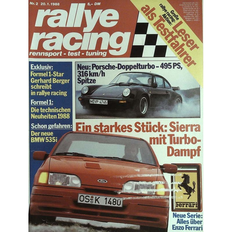 PLUS: Große rallye racing Aktion: Leser als Testfahrer - Neu: Porsche Doppelturbo, 495 PS, 316 km/h Spitze - Neue Serie: Alles über Enzo Ferrari - Exklusiv: Formel 1 Star Gerhard Berger schreibt in rallye racing - Formel 1: Die technischen Neuheiten 1988 - Schon gefahren: Der neue BMW 535i