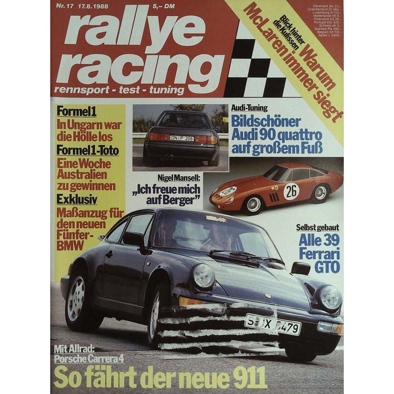 PLUS: Audi Tuning: Bildschöner Audi 90 quattro auf großem Fuß - Selbst gebaut: Alle 39 Ferrari GTO - Nigel Mansell: Ich freue mich auf Berger - Blick hinter den Kulissen: Warum McLaren immer siegt - Formel 1: In Ungarn war die Hölle los - Formel 1 Toto: Eine Woche Australien zu gewinnen - Exklusiv: Maßanzug für den neuen Fünfer BMW