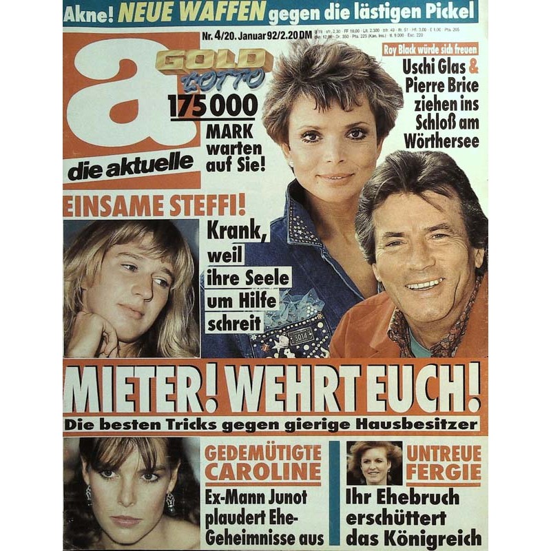 REPORTAGEN „Ein Schloß am Wörthersee": Uschi Glas und Pierre Brice sind das neue Traumpaar Herzogin Sarah: Ihr Ehebruch erschüttert England Steiff Graf: Ihre Seele schreit um Hilfe Prinzessin Caroline: Peinliche Enthüllungen von Ex-Mann Junot Josef Neckermann: Tierliebe über den Tod hinaus Peter Rapp: Der Moderator läßt sich schon wieder scheiden Erich Böhme: Die neue Frau an seiner Seite Drafi Deutscher: So legte er den Gerichtsvollzieher rein Dallas": Ein völlig neuer „J.R. Gesellschaft: Peinlicher Streit um das Erbe eines Millionärs Filmball: Glanzvoller Treffpunkt der Stars Brot: Alles über den Gift-Skandal „Traumhochzeit": Eine Traumfrau trumpft bei RTLplus auf „Diese Drombuschs": Günter Stracks Ehefrau verrät Geheimnisse Athinea Onassis: Endlich Famillenglück Aktuelle Blitzlichter Königliche Augenblicke Aktuelles aus aller Welt