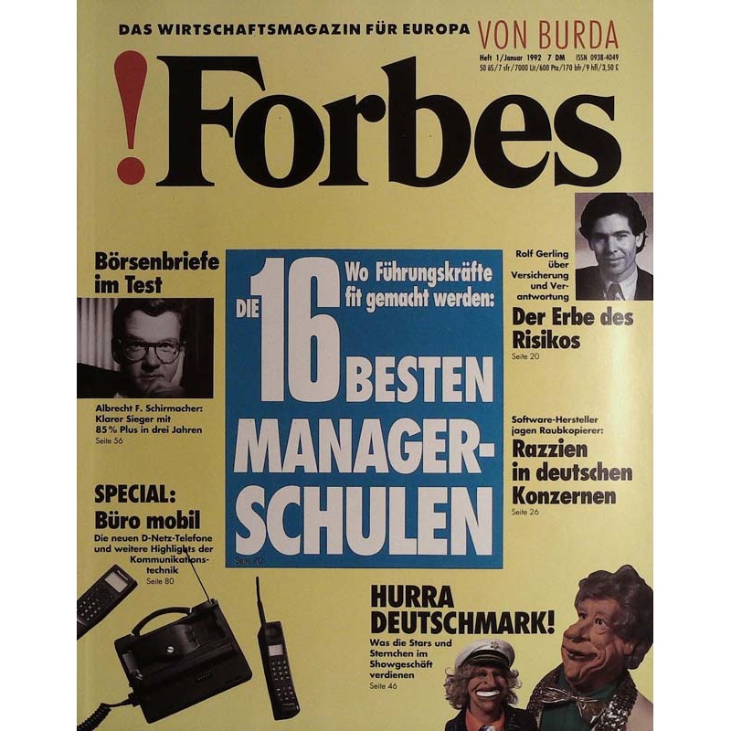 PLUS: Börsenbriefe im Test: Albrecht F. Schirmacher. Klarer Sieger mit 85 % Plus in drei Jahren - Special Büro mobil: Die neuen D-Netz-Telefone und weitere Highlights der Kommunikationstechnik - Hurra Deutschmark! Was die Stars und Sternchen im Showgeschäft verdienen - Das Erbe des Risikos: Rolf Gerling über Versicherung und Verantwortung - Razzien in deutschen Konzernen: Software Hersteller jagen Raubkopierer