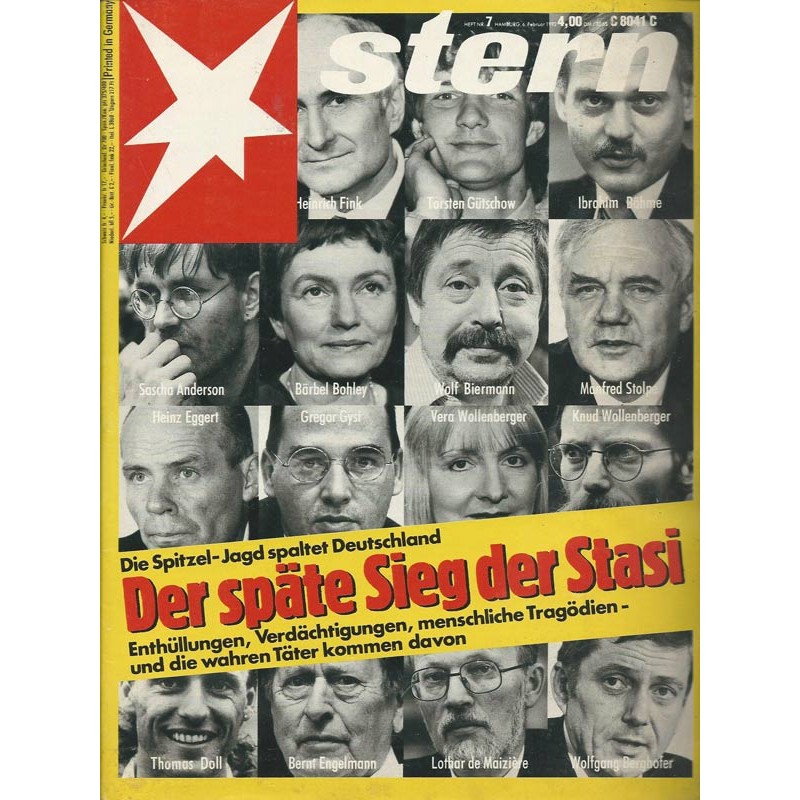Titelbild: Der späte Sieg der Stasi. Die Spitzel Jagd spaltet Deutschland. Enthüllungen, Verdächtigungen, menschliche Tragödien und die wahren Täter kommen davon. Abgebildete Personen auf dem Titelbild: Heinz Eggert, Gregor Gysi, Vera Wollenberger, Knud Wollenberger, Manfred Stolpe, Wolf Biermann, Bärbel Bohley, Sascha Anderson, Torsten Gütschow, Ibrahim Böhme, Thomas Doll, Bernt Engelmann, Lothar de Maiziere, Heinrich Fink und Wolfgang Berghofer