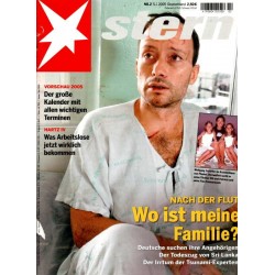 Titel FLUTKATASTROPHE Nach dem Seebeben kämpfen die Menschen gegen Armut, Krankheit und Hunger Sri Lanka — Gerettet aus dem Todeszug Vom Krankenbett eines Hospitals in Phuket aus organisiert der verletzte Deutsche Wolfgang Schäffer die Suche nach seiner Frau und seinen Töchtern Mehr als 1000 deutsche Urlauber sind verschollen. Auch stern und stern.de helfen bei der Suche Haben Wissenschaftler des Tsunami-Zentrums auf Hawaii zu spät vor der Katastrophe gewarnt? Sie quälen sich mit Selbstvorwürfen Deutsch-Tsunami — der Zwischenruf von Hans-Ulrich Jörges Hinfliegen oder nicht ? Der stern beantwortet die zehn wichtigsten Fragen für die Urlaubsplanung Legende vom Leichengift — Getötete Flutopfer stellen normalerweise keine Seuchengefahr dar