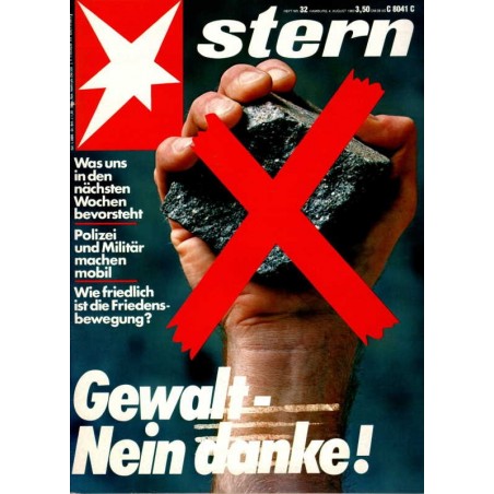 Deutschland Heißer Herbst '83 Die Geschichte des gewaltlosen Widerstands Wie die Friedensbewegung gegen das Wettrusten kämpfen will 200 Frauen protestieren in einem Zeltlager im Hunsruck gegen die Atomrustung Gewappnet mit Gas und Gummi - innenminister Zimmermann will die Polizei aufrusten Mordprozeß: Der Fall Hößl wird Justizgeschichte machen Ausbürgerung: Wie die DDR auf legalem Wege verlassen werden kann Flüchtlinge: Voller Hoffnung gingen die letzten "Boat-People« vor einem Jahr von Bord der "Cap Anamur«. Heute haben sie Heimweh nach Vietnam Staatsbürgerschaft: Weshalb in Baden-Württemberg Kindern aus gemischt-nationalen Ehen verweigert wird. Deutsche zu werden Piratensender: Ein Pfarrer aus Herten übertrug seine Sonntagspredigt ein Jahr lang über einen eigenen UKW-Sender. Jetzt stoppte ihn die Post Kriminalität: In Hagen kommt ein Polizeichef vor Gericht, der den Staat um 200 000 Mark betrogen haben soll Hundehaltung: Der Kläffer von Hasenleiser