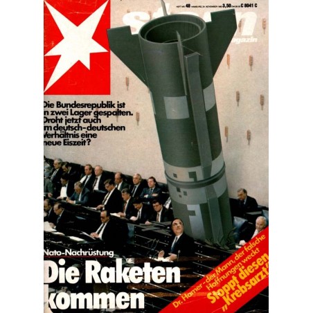 DEUTSCHLAND Raketen: Kommt mit der Nato-Nachrüstung eine deutsch-deutsche Eiszeit? Impressionen von der »Woche des Zorns« »Abschreckung durch Selbstmord«: Mit Nachrüstung und konventioneller Aufrüstung setzt die Bundesregierung auf offensive statt defensive Verteidigung Helmut Schmidts letzte Schlacht Standpunkt: Weshalb der amerikanische Ostexperte Arthur Macy Cox die Stationierung der Pershing II für einen »tragischen Fehler« hält Niedersachsen: Bei der nächsten Landtagswahl will Gerhard Schröder für die SPD gegen CDU-Ministerpräsident Albrecht antreten Pferdezucht: Kraft macht Karriere. Kaltblüter sind wieder gefragt CSU: Franz Josef Strauß drängt nach Bonn, doch er hat schlechte Karten Tierquälerei: Das Solinger »Hähneköppen« soll gestoppt werden Friedensbewegung: Staatsdiener, die an Anti-Raketen-Protesten teilnahmen, müssen jetzt mit Disziplinarmaßnahmen rechnen Sozialdemokraten: Wie das Godesberger Parteitagprogramm bis 1987 reformiert werden soll Polizei: Ein Unschuldiger kam in Haft, weil ein Computer falsch gefüttert wurde Prozeß: Weshalb der Mann, der den bayrischen Bauskandal aufgedeckt hat, sich vor Gericht verantworten muß Eine Frau ohrfeigte einen Mann, dem sie Vergewaltigung vorwirft. Jetzt wurde sie wegen Körperverletzung angeklagt