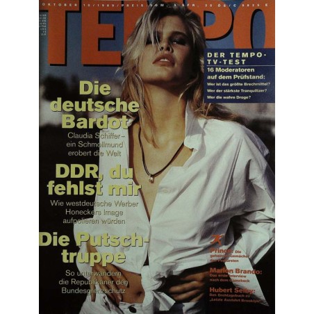 PLUS: DDR, du fehlst mir: Wie westdeutsche Werber Honeckers Image aufpolieren wollen - Die Putschtruppe: So unterwandern die Republikaner den Bundesgrenzschutz - Der Tempo TV-Test: 16 Moderatoren auf dem Prüfstand. Wer ist das größte Brechmittel? Wer der stärkste Tranquilizer? Wer die wahre Droge? - Prince: Die geheimen Gemächer des Popfürsten - Marlon Brando: Das erste Interview nach dem Comeback - Hubert Selby: Das Drehtagebuch zu Letzte Ausfahrt Brooklyn