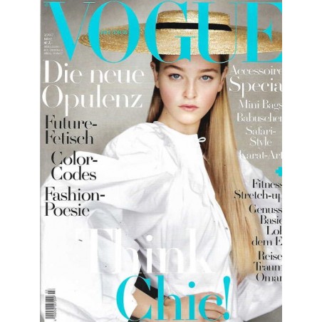 MODE EN VOGUE Wilde Tiere, modische Plätzchen und die Königin der Herzen FUNTASIE! Magic Mix: Shorts, Blusen und ausdrucksstarke Accessoires ZART-ART Kunstvoll filigran: Diamantschmuck ORIENT-TRIP Schuhe im marokkanischen Babouche-Stil MIKRO-WELLE Der neue Minimalismus: Taschen im Kleinformat STYLE-SAFARI Eleganz trifft Exotikele. STRAND-GUT Espadrilles bringen Bea ing in die City TIEFSINNIG Suggestiv: Schmuck in purem Schwarz FIT FÜR DEN LAUFSTEG Fashion goes sporty EL DORADO Gold, Silber & Bronze setzen Luxusakzente ZEN-ZAUBER Hochblüte für fernöstliche Stil-Inspirationen WILD-FANG Löwenanhänger von Thomas Sabo LIPPENBEKENNTNIS Lipstick Cases von Valentina Garavani SZENE-GÄNGER Sandalen von Ugg by Preen BELLA PINK „Lucia"-Bag von Dölce & Gabbana WIEDERSEHEN Brillen von Arthur Arbesser for Silhouette PATENT FÜR DEN DURCHBLICK Vor 140 Jahren erhob Rodenstock die Sehhilfe zum Statement TAGTRÄUME Kleider wie ein Gedicht, Silhouetten wie sinnliche Poesie: moderne Fashion-Romantik DARK ROMANGE Fetisch-Avantgarde: Futurismus meets Leder und Latex COLOR-CODES Pure Farben, starke Kontraste NEW BOHEME Schillernde Kooperation mit Swarovski: Mode aus dem „VOGUE Salon" SIDEKICKS Accessoires mit dem Talent zur Hauptrolle NEW YORK LADY Morgendämmerung im Central Park — magische Bühne für surreal-expressive Looks FAVORITEN Die Highlights im März